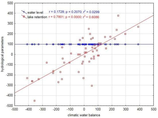 Differences between evaporation and precipitation (climatic water balance) and water level fluctuations did not show significant correlations (Figure 5), in opposition to the water retention. Pearson correlation between water retention and the climatic water balance was strong and highly significant (p < 0.0001).