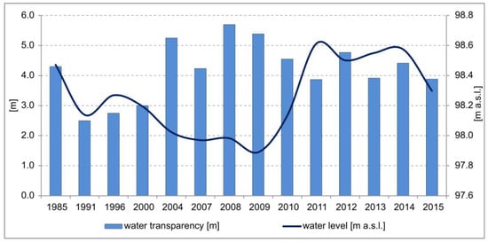 The worst water quality was recorded at the turn of the 1990s, when, in the summer months, due to intense phytoplankton blooms, the transparency of water did not exceed 3 m (based on personal communication). From 2000 to 2004, the Secchi disk transparency showed a tendency to increase (Figure 6). Since 2008, a decline in the Secchi disk transparency has been observed, which, in 2015, was at a level of 4 m (Figure 6). Correlation between the water level and Secchi disk visibility, determined during the summer time, was low, but statistically significant (r = −0.29, p < 0.05).