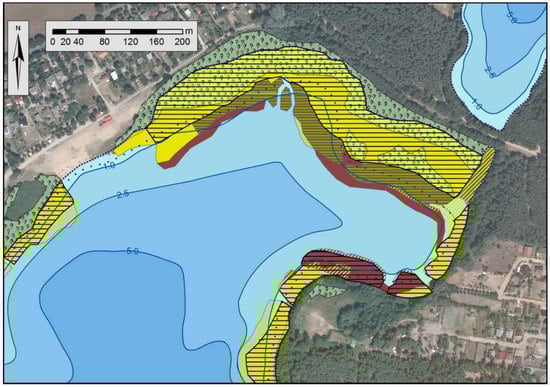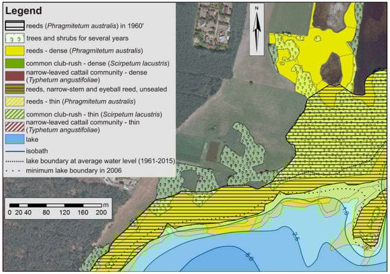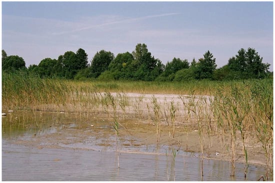 Changes in the water level may cause important transformations in the composition of plant species, for instance, they may support the growth of fast-growing, highly plastic taxa. Recently, processes of lake overgrowth by reeds have been observed in many lakes [,], mostly due to lowering water levels. Additionally, the progressive succession of shrubs or trees may be observed with the depletion of water depth, mostly in the shallowest part of the water body. Taking into consideration the important roles of the littoral and riparian zone in lake functioning, recognition of the processes of plant succession and their direction is crucial.