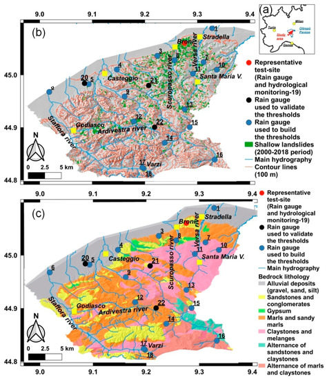 The study area, Oltrepò Pavese hilly zone: (a) location of the study area; (b) main geomorphological features and distribution of shallow landslides occurred in a 2000–2018 time span; (c) bedrock lithological features [36,37,38].