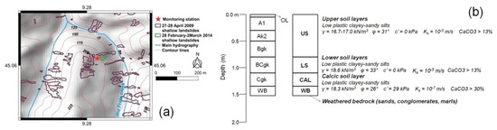 - Identification of the representative testsite. Montuè was chosen as testsite exhibiting the typical geological and geomorphological settings prone to shallow landsliding in the study area (Figure 2a). The typical soil profile is shown in Figure 2b and described in detail in Bordoni et al. [24]. Test-site soils are low plastic clayey–sandy silts with a thickness mostly between 0.5 and 1.5 m. From the ground surface till 0.7 m, the upper soil layer (US) is characterized by a high content in carbonates (15%), as soft concretions, and unit weight in the order of 16.7–17.0 kN/m3. Below this level, the lower soil layer (LS), from 0.7 to 1.1 m from the ground level, is characterized by similar carbonate content with respect to the US, but it presents a higher unit weight, ranging around 18.6 kN/m3. Between 1.1 and 1.3 m from ground level, there is a layer (CAL) characterized by a significant increase in carbonate content, till 35.3%. The weathered bedrock (WB), which is composed of sand and poorly cemented conglomerates, is at 1.3 m from the ground surface. US and LS are characterized by similar values of friction angle, equal to 31° and 33°, respectively, and by a nil effective cohesion. Instead, the CAL horizon has a lower value of friction angle (26°), but a higher effective cohesion (29 kPa). Saturated hydraulic conductivity (Ks) is in the order of 10−5 m/s, except for CAL level that is characterized by a saturated hydraulic conductivity of 10−7 m/s. Soil water characteristic curves (SWCCs) of the soil layers, fitted through Van Genuchten’s [46] model, are quite similar [47], with wetting paths having saturated (θs) and residual (θr) water contents of 0.37–0.40 and 0.01 m3/m3, respectively. λ and n fitted parameters of the model range between 0.011 and 0.017 kPa−1 and between 1.20 and 1.40, respectively.From the geomorphological point of view, the testsite has steep slopes (steepness higher than 15° and mostly between 26° and 35°) and is east-facing. The slope elevation ranges from 170 to 210 m a.s.l. The land use is mainly constituted by grass and shrubs passing to a woodland of black robust trees at the bottom of the slope. Shallow landslides occurred on this slope in response to two events: (i) on 27 and 28 April 2009, as a consequence of an extreme rainfall event characterized by 160 mm of cumulated rain in 62 h; (ii) between 28 February and 2 March 2014, as a consequence of an event of 68.9 mm in 42 h. The source areas of these shallow landslides have a slope angle higher than 25°, especially between 30° and 35°. The failure surfaces are located at a depth of around 1.0–1.2 m from ground level.In the test-site slope, an integrated meteorological and hydrological monitoring station has been installed since 27 March 2012, and is still functioning [24]. The station allows meteorological parameters (rainfall depth, air temperature and humidity, air pressure, net solar radiation, wind speed and direction) to be measured, together with soil pore-water pressure, at depths of 0.2, 0.6, and 1.2 m from ground level, and soil water content, at depths of 0.2, 0.4, 0.6, 1.0, 1.2, and 1.4 m from ground level. Further details on this monitoring station are reported in Bordoni et al. [24,47].