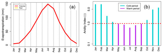 Figure 4. (a) Average monthly potential and real evapotranspiration in the study area; (b) warm and cold periods identified through the trend of the aridity index.