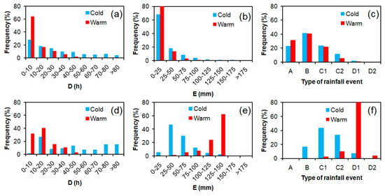 Frequency distribution of duration, cumulated amount, and typology of the rainfall events identified in the period 2000–2018: (a) frequency distribution of duration (D) of the rainfall events; (b) frequency distribution of cumulated amount (E) of the rainfall events; (c) frequency distribution of typology of rainfall events; (d) frequency distribution of duration (D) of the rainfall events triggering shallow landslides; (e) frequency distribution of cumulated amount (E) of the rainfall events triggering shallow landslides; and (f) frequency distribution of typology of rainfall events triggering shallow landslides.
