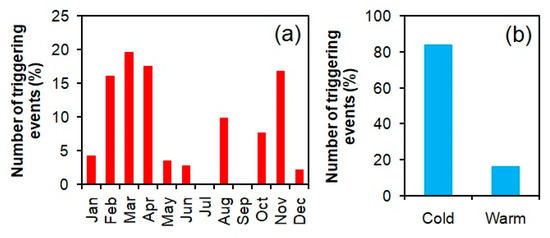 Distribution of shallow-landslide-triggering events in the period 2000–2018 along the different months of the year (a) and cold and warm periods in a year (b).