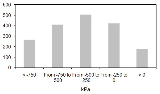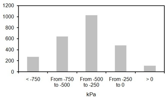 The distribution of the measured values of pore-water pressure (Table 3 and Figure 8) presents a certain degree of Gaussian trend, as confirmed by the values of the skewness very close to 0 and by the results of Shapiro–Wilk test, whose WS-W statistic did not allow us to reject the null hypothesis of gaussianity at 95% confidence level (WS-W = 0.92; p-value = 0.06). The first quartile of this distribution was equal to −846 kPa, while the third one was of −20 kPa.