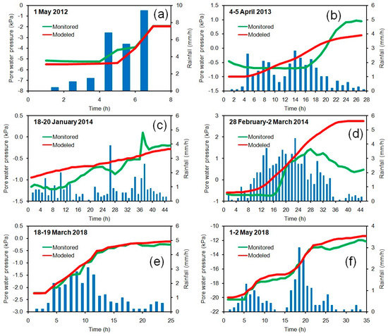 Comparison of measured and estimated by TRIGRS pore-water pressure trends at the typical depth of shallow-landslide sliding surface (1.0–1.2m from ground) for the selected rainfall events at the monitoring station in the representative testsite: (a) 1 May 2012; (b) 4–5 April 2013; (c) 18–20 January 2014; (d) 28 February–2 March 2014; (e) 18–19 March 2018; (f) and 1–2 May 2018.