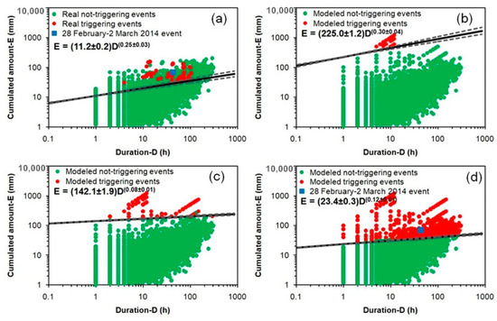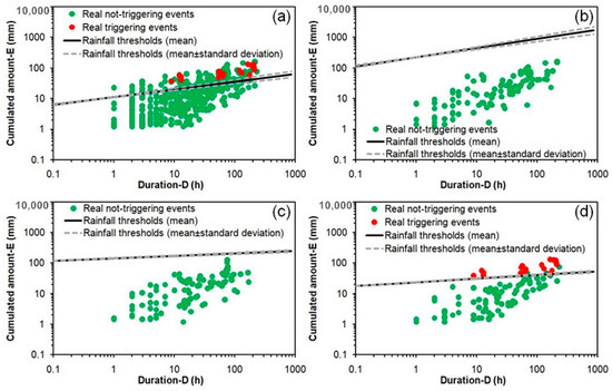 Duration(D) and Cumulated amount (E) conditions for the rainfall events recorded in the period August 1992–August 1997 and used for the validation phase, and the corresponding thresholds: (a) threshold reconstructed through the empirical method; (b) threshold reconstructed through the physicallybased method, considering an initial pore-water pressure of −20 kPa at the depth of the sliding surface (TRIGRS/–20); (c) threshold reconstructed through the physicallybased method considering an initial pore-water pressure of −10 kPa at the depth of the sliding surface (TRIGRS/–10); (d) threshold reconstructed through the physicallybased method, considering an initial pore-water pressure of 0 kPa at the depth of the sliding surface (TRIGRS/0).