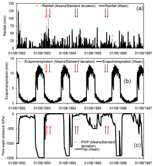 Pore-water pressure trend at typical depths of the sliding surfaces (Figure 11c) was characterized by the typical hydrological behaviors of the soil layers at the same depth, as inferred by field data at the test-site slope during the monitoring period since March 2012 [24,47]. These soil layers reached the driest condition during warm months of the year, especially between June and October, when few thunderstorms were interspersed by prolonged periods without rain and with significant evapotranspiration rates. The first significant rainfall events of October–November, characterized by at least 30 mm of rain fallen in 24 h, caused a slight increase in pore-water pressure. A more evident pore-water pressure increase was observed in the following wet period, between November and January, when rainfall events of at least 20–30 mm/day were rather close to each other, and evapotranspiration rates were limited (<1 mm/day) (Figure 11c). During both cold and wet months, pore-water pressure generally remained lower than –20 kPa, reaching saturated conditions in correspondence of other important rainfall events of at least 20 mm/day. Saturated conditions and the development of positive pressures (corresponding to the formation of a perched water table) were most probable till the end of March. In April, pore-water pressure began to decrease down to values lower than –20 kPa, due to an increase in evapotranspiration rates (about 4–5 mm/day) and to an increase in dry days between two different rainfalls. Instead, till the end of June, after very intense events of at least 50 mm of rain fallen in 12 h, a transient increase of pore-water-pressure till values of about −10 kPa was observed. Pore-water pressure tended to decrease very fast, till the driest soil conditions, since the end of June-beginning of July.