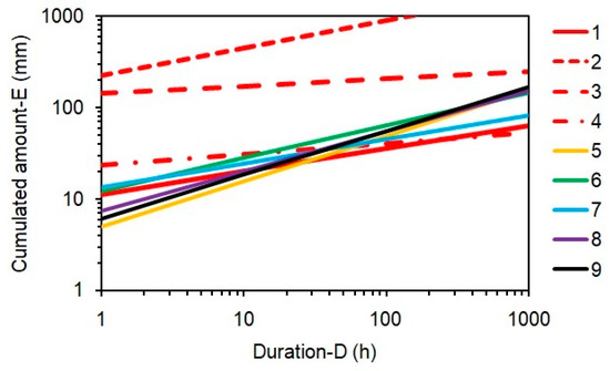Comparison between the reconstructed thresholds for Oltrepò Pavese area, with some regional, national, and world thresholds. Source: (1) empirical threshold (mean fitting parameters) of Oltrepò Pavese area; (2) physicallybased threshold for initial pore-water pressure of −20 kPa (mean fitting parameters) of Oltrepò Pavese area (TRIGRS/–20); (3) physicallybased threshold for initial pore-water pressure of −10 kPa (mean fitting parameters) of Oltrepò Pavese area (TRIGRS/–10); (4) physicallybased threshold for initial pore-water pressure of 0 kPa (mean fitting parameters) of Oltrepò Pavese area (TRIGRS/0); (5) world [77]; (6) Italy [74]; (7) Liguria [8]; Sicily [75]; and (9) Italian Alps [76].