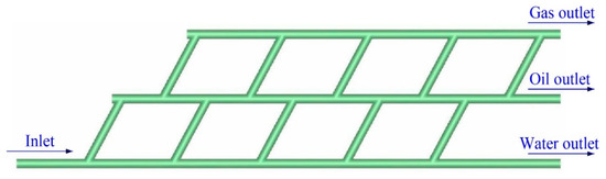 The multitube T-junction separator consists of three layers of horizontal pipes. The horizontal pipes of each layer are connected by inclined vertical pipes. Under the effect of gravity, the gas phase rises to the upper horizontal pipe, the oil phase rises to the middle horizontal pipe, and the water phase sinks to the lower horizontal pipe, finally realizing the oil-water-gas three-phase separation. Therefore, the outlet of the upper horizontal pipe is the air outlet, the middle one is the oil outlet, and the lower one is the water outlet. Two types of multitube T-junction separators were applied, with an inner diameter of 50 or 100 mm. The geometry model of the multitube T-junction separator is shown in Figure 1. There are five lower inclined pipes and five upper inclined pipes. The spacing between inclined pipes is 1000 mm, and the inclination angle is 60°.