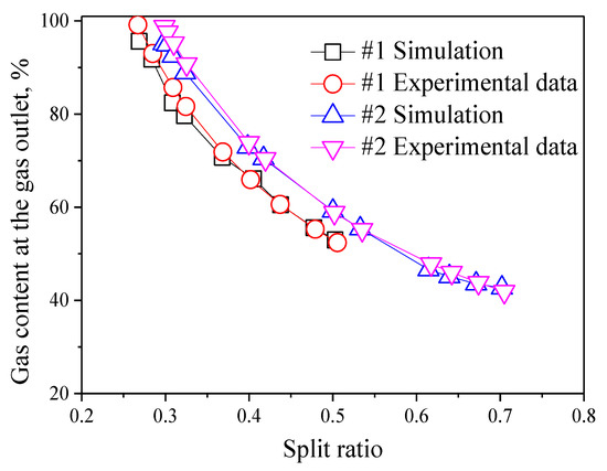 The validation was made by comparing the results obtained from the simulation with the experimental data obtained by Yang et al. [5]. They developed an experimental study on gas and liquid separation at T-junction tubes. The experimental separator consisted of four connecting tubes, and the angle between the straight arm and the lateral arm was 60°, and the pipe diameter was 50 mm. Air and water were chosen as the test fluids. In Figure 3, the mixture flow rate was 4.53 m3/h and the gas content was 0.26 in case #1, and the mixture flow rate was 8.13 m3/h and the gas fraction was 0.30 in case #2. The split ratio was defined as the ratio of the mixture flow rate at the gas outlet to that at the inlet. As can be seen, the variation of the gas content at the gas outlet with the split ratio obtained by numerical simulation was in agreement with the experimental results. With the increase in the split ratio, the gas content at the gas outlet gradually decreased. Therefore, the numerical model developed in this study was adequate to predict the separation behavior and hydrodynamic characteristics in the multitube T-junction separator.