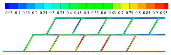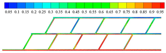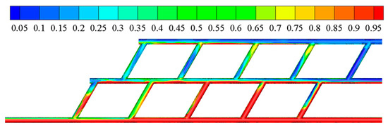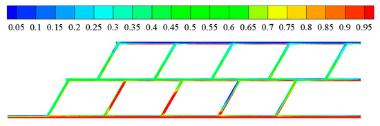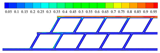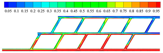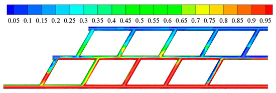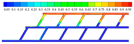 Table 2 shows the effect of the oil droplet size on the separation performance of multitube T-junction separators with inner diameters of 50 mm under inlet 20 m3/h flow rates. The content of each phase is based on volume. Figure 4, Figure 5, Figure 6 and Figure 7 show the corresponding phase distribution in the separator with oil droplet sizes of 1 and 2 mm. In the figures, blue represents low content of the corresponding phase and red represents high content of the corresponding phase. When the oil droplet size increased from 1 to 2 mm, the water content at the water outlet increased from 94.91% to 97.80%, and the water content at the oil outlet changed from 29.76% to 22.74%. However, the separation performance changed slightly for the oil droplet size of 2, 3, and 4 mm. When the oil droplet size increased, the gas content at the gas outlet increased rapidly, which meant that the degassing effect became better. As there were usually many elbows in the conveying pipeline, it is easy to cause emulsification when the oil, gas, and water flowed in it, which made the oil droplet size smaller [28]. Therefore, it is necessary to increase the oil droplet size through some measures before flowing into the T-junction for separation. For example, chemical agents can be added for demulsification before separation.