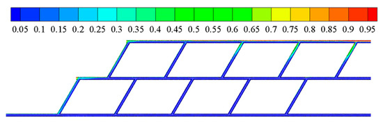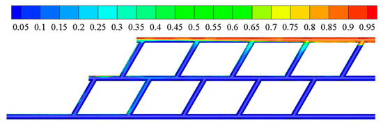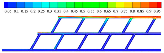 Table 5 shows the effect of oil content on the separation performance of multitube T-junction separators with inner diameters of 100 mm under inlet 50 m3/h flow rates. Figure 16, Figure 17, Figure 18 and Figure 19 show the corresponding phase distribution in the separator with oil content of 15% and 10%. As can be seen, almost pure water can be obtained at the water outlet for different oil content, which was different from the phase split at the multitube T-junction separator with an inner diameter of 50 mm. The inlet velocity was high, owing to the small pipe diameter. The residence time of the incoming liquid in the multitube T-junction separator was short. It became difficult to separate the oil phase from the water phase when the oil content was high, which was similar to the gas-liquid separation results at horizontal T-junctions, as observed by Baker et al. [29]. As can be seen from the gas content distribution, the oil content had little influence on the degassing effect. Under all the conditions, more than 90% of the gas was discharged from the gas outlet, which met the requirements of degassing.
