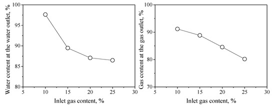 The remaining inlet mixture flow rates and oil-water ratio were unchanged; the inlet gas content was adjusted to investigate its effect on the separation performance of multitube T-junction separators. Figure 20 shows the variations of the water content at the water outlet and the gas content at the gas outlet with the inlet gas content. As the inlet gas content increased from 10% to 25%, the water content at the water outlet decreased from 97.63% to 86.49%, and the gas content at the gas outlet decreased from 91.17% to 80.17%. Moreover, the oil content at the oil outlet also decreased from 48.81% to 36.27%. This indicated that the separation performance became worse as the inlet gas content increased. This is because a slip velocity between the gas phase and liquid phase existed, and this slip velocity induced a shear action. As the gas content increased, the shear action enhanced and the carrying capacity of the gas stream improved gradually, as suggested by Yang et al. [30]. Gradually, the gas stream was able to overcome the gravity effect of the liquid phase and carried them upward via the inclined vertical pipe, as can be seen from Figure 21.