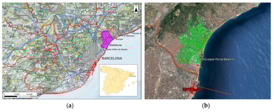 Badalona, with more than 215,000 inhabitants within its administrative limits on a land area of more than 21.2 km2, is located in eastern Catalonia (Spain) and is part of the Barcelona Metropolitan Area (in Spanish AMB) (Figure 1). It is situated on the left bank of the Besòs River facing on the Mediterranean Sea, and backed by the Serra de la Marina mountain range. This city is one of the six research sites across Europe (Portugal, Spain, Cyprus, Germany, the Netherlands, and Norway) of the EU project BINGO (Bringing Inovation to Ongoing water management—a better future under climate change (2015–2019)). The project strives to provide practical knowledge and tools to end users, water managers, and decision and policymakers for a better informed decision making process under the uncertainties of climate change. The city administrative division consist in six districts and 24 subdistricts, and the average population density of the city is approximately 10,000 inhab/Km2, although this figure can increase significantly in some districts of the old town and the city centre. The morphology of Badalona presents areas with high gradients (close to Serra de la Marina) and flat areas near the Mediterranean Sea. Moreover, the land was strongly urbanized during the last decades. These characteristics, together with the Mediterranean rainfalls characterized by high intensity and short duration, leave the city in a flood-prone situation. All these aspects put urban drainage in Badalona in the spotlight as urban flash floods happen in several critical areas with significant economic damages and high hazard conditions for pedestrian and vehicular circulation. Its drainage network is mainly a combined sewer system with 318 km of conduits, 26% of them allowing man-entry. There are nine catchments in the city, most of which discharge from the mountain to the sea. Waste water is intercepted by a main sewer placed along the coastal area that conveys it to the Besòs Waste Water Treatment Plant (WWTP) (Figure 1b).