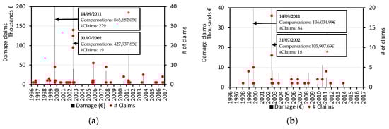 On the other hand, in terms of economic damages, over the period 1996–2016 more than 60 flood events caused damages to properties in Badalona, summing up more than 1.8 Million Euro in 499 claims according to the data received from the Spanish insurance company Consorcio de Compensación de Seguros (CCS). The CCS is a state-owned enterprise attached to the Ministry of Economy and Enterprise that performs several functions complementing the Spanish Insurance Industry, enhancing its stability and protecting the insured. Regarding damages to vehicles, more than 160 claims have been reported in the same period (1996–2016) with a total economic damage of 478,000€ (Figure 2).