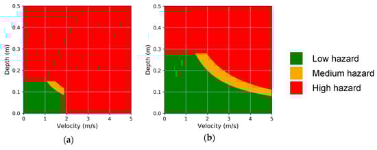A sample of 26 subjects was tested in the last experimental campaign carried out by Martínez-Gomariz et al. [,] considering different conditions and exposure combinations (i.e., types of shoes, hands busy or free, and visibility conditions). The function (v·y) = 0.22 m2·s−1 was proposed as the threshold for the stability of a pedestrians exposed to a water flow produced by a pluvial flood, usually characterized by low water depths and high velocities. Based on Martínez-Gomariz et al. [,] results, the proposed limits for hazard delimitation in the present study are: Low hazard below the product (v·y) = 0.16 m2·s−1, medium hazard for values (v·y) comprised between 0.16 m2·s−1 and 0.22 m2·s−1, and high hazard for those above (v·y) = 0.22 m2·s−1. Furthermore, it has been considered that when the water depth exceeds 0.15 m, the hazard is high, irrespective of the product of velocity and water depth. Therefore, low and medium hazard hydraulic conditions are both found below a water depth of 0.15 m. The maximum velocity that assures stability conditions for pedestrians, regardless the water depth, was established as 1.88 m·s−1. The hazard criterion for pedestrians is represented graphically in Figure 3a.