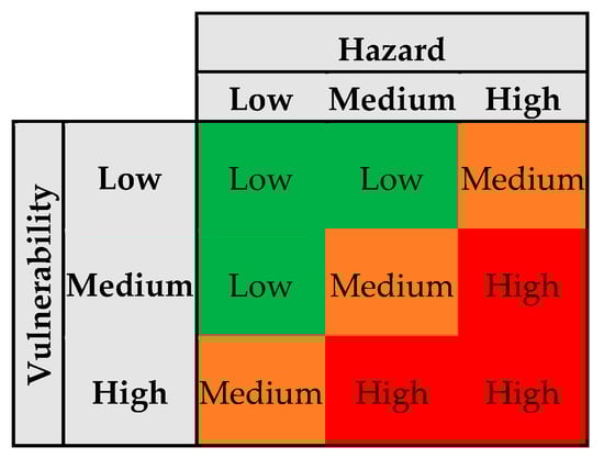 The methodologies described previously have been applied to assess risk for pedestrians and vehicles under current and future rainfall conditions (RCP 8.5). In order to determine the risk of a specific area, hazard and vulnerability levels have been overlapped thereby establishing the risk level based on the combinations indicated in the risk matrix of Figure 5. As an example, Figure 6 illustrates the risk maps for both pedestrians and vehicles for a flood produced by a 10-year-return-period design rainfall.