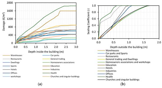 (a) Depth-damage and (b) sealing coefficients curves developed for Badalona case study.