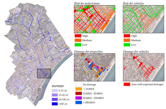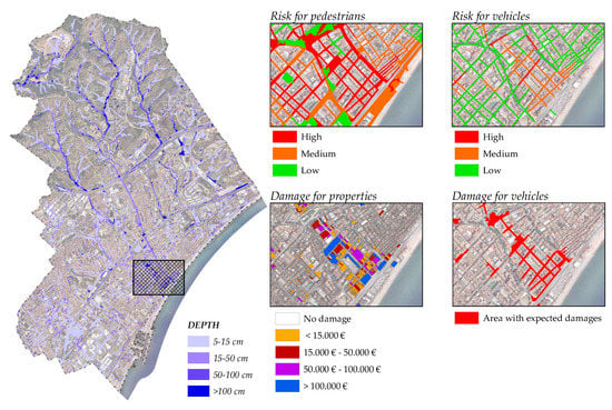Firstly, flood maps for different design rainfalls related to 2, 10, 100, and 500 years return periods were obtained using the 1D–2D model in order to assess the water depth per each building. Secondly, the land use information was obtained by downloading a shapefile from the Web Portal of the General Directorate of the Spanish Cadastre. This georeferenced database file stores parcels information for the entire municipality, and it is freely downloadable. Therefore, the type of property, the dimension of the buildings and the situation within the case study area is known.