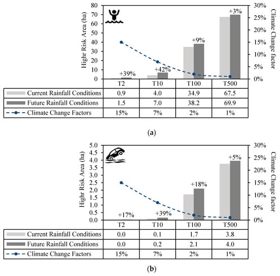On the other hand, the obtained quantitative results in terms of high risk areas are presented in Figure 10 together with the climate change factors associated to each return period considered. According to these outcomes an important percentage increment of high risk area for pedestrians for low return periods (39% for T2 and 42% for T10) and for vehicles (17% for T2 and 39% for T10). However, both for T2 and T10 the increment of high-risk area in terms of absolute values is not significant, particularly for vehicles. Whereas, higher return-period rainfalls (T100 and T500) would cause important increase of high risk areas and thus their expected percentage increment would be translated into relevant absolute-value increments of high risk area. Risk for pedestrians is predicted to increase up to 9% and 3% for T100 and T500 respectively. Finally, risk for vehicles would increase up to 18% and 5% for 100-year and 500-year return period respectively.