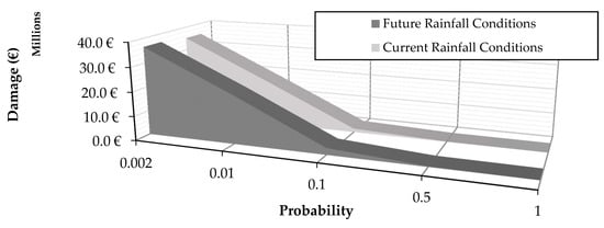 The expected annual damage (EAD) is the indicator used here to measure changes in flood impacts according to expected future rainfall conditions (RCP 8.5). Once the direct and indirect damages are estimated according to the methodologies described, the EAD can be obtained. It may be calculated through the integration of the area under the curve that Figure 11 shows, result from plotting probability of occurrence of the damage and its monetary value [].