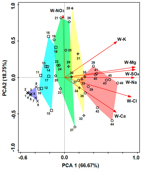 The ordination of irrigation water samples, numbered from 1 to 46, was assigned according to the gradient of ECw as shown in Figure 2. Samples were distributed along the gradient from −0.6 to 1.0 on the PCA1 axis. Five polygons, with colors from blue to red representing the ECw ranges of 0.06–0.20 to 0.90–1.39 S/m, respectively, were also arranged in this order. As the concentration of Na, SO4, Mg, and Cl were more strongly positively correlated with the PCA1 axis, we concluded that these ions mainly decided the irrigation water salinity and the array of the samples along this axis. Na, SO4, Mg and Cl were the dominant ions in all irrigation water, accounting for, on average, 18.9%, 48.1%, 8.4%, and 20.0% of total dissolved solids, respectively. The NO3 concentration mainly resulted in the variation of chemical components along the PCA2 axis. As the number along this axis was not regularly arranged, and the concentration of NO3 had no statistical correlation with ECw value, this anion had no significant effect on irrigation water salinity.