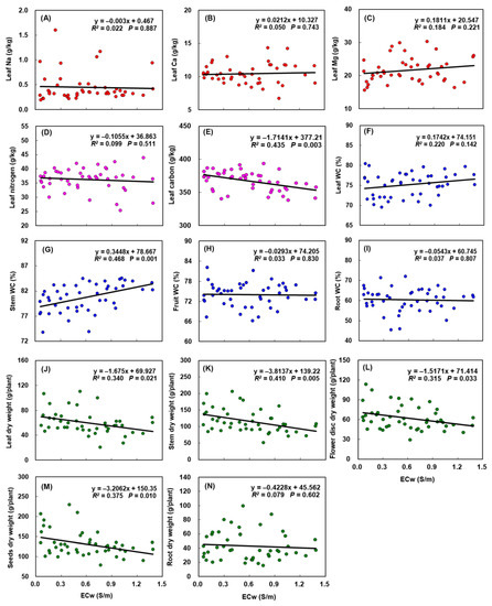 Effects of increasing irrigation water salinity on: (A) Na, (B) Ca, (C) Mg, and (D) N, (E) C concentrations of leaf; water content (WC) of (F) leaf, (G) stem, (H) seeds, and (I) root; and dry weight of (J) leaf, (K) stem, (L) flower discs, (M) seeds, and (N) roots. ECw is the electrical conductivity of irrigation water.