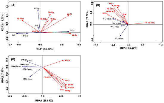 Bi-plot from the redundancy analysis (RDA) that shows the relationships between the irrigation water ions and the Na, Ca, Mg, nitrogen (N), and carbon (C) concentrations in (A) leaf, (B) water content (WC), and (C) dry weight (DW) of different organs. P-Na means leaf Na concentration, P-Ca means leaf Ca concentration, P-Mg means leaf Mg concentration, P-C means leaf carbon concentration, P-N means leaf nitrogen concentration. W-K means K concentration in irrigation water, and W-Na means Na concentration, W-Ca means Ca concentration, W-Mg means Mg concentration, W-Cl means Cl concentration, W-SO4 means SO4 concentration, and W-NO3 means NO3 concentration in irrigation water.
