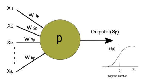 where p is the number of hidden neurons. A neuron computes an output, based on the weighted sum of all its inputs (Sp), according to an activation function (f(Sp)). Finally, an activation function, which is applied to Sp, provides the final output from this logistic sigmoid [] (see Figure 1). The sigmoid activation function is given as: