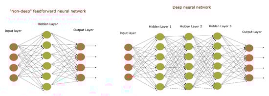 The so-called Deep Neural Networks (DNN) model is a direct extension of the feed-forward network that contains multiple hidden layers that are stacked as shown in Figure 2 []. The DNN model becomes “deeper” as the number of hidden layers increases. Deeper NN models allow for simulating more complicated, nonlinear mapping functions between input and output data. However, DNN models often suffer from overfitting when using too many hidden layers. This problem can be mitigated by dropping layers. We have tested the DNN model with one, two, and three hidden layers to determine the optimum number of hidden layers and to minimize overfitting.