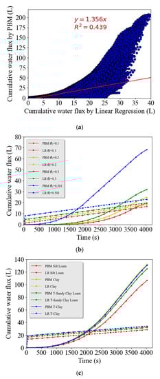 Comparison of cumulative water fluxes (Qc in liters, L) calculated by the physically-based models PBM and the Linear Regression (LR) model ((a) overall, (b) different initial water contents, (c) different textures)).