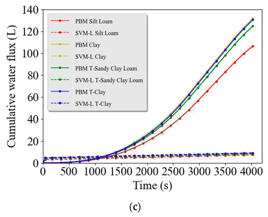 Comparison of cumulative water fluxes (Qc in liters, L) calculated by the PBM and the Linear Support Vector Machine (SVM-L) model ((a) overall, (b) different initial water contents, (c) different textures)).
