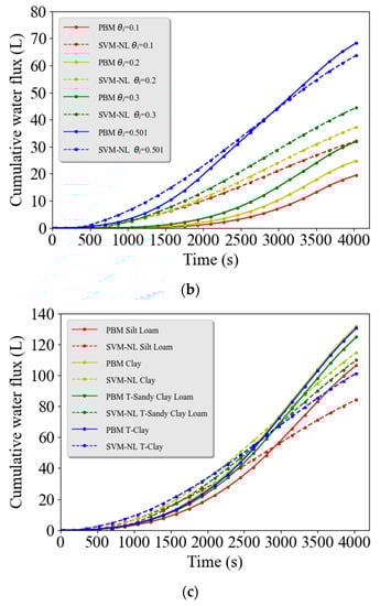 Comparison of cumulative water fluxes (Qc in liters, L) calculated by the PBM and the Nonlinear Support Vector Machine (SVM-NL) model ((a) overall, (b) different initial water contents, (c) different textures)).