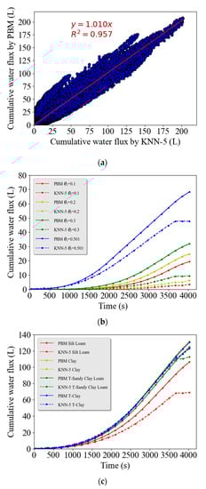 Comparison of cumulative water fluxes (Qc in liters, L) calculated by the PBM and the k-Nearest Neighbor Regression (kNN-5) model ((a) overall, (b) different initial water contents, (c) different textures)).