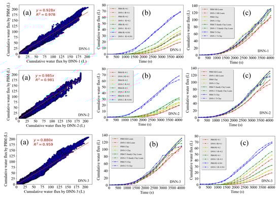 Comparison of cumulative water fluxes (Qc in liters, L) calculated by the PBM and the Deep Feed-Forward Neural Network (DNN-1 (top row), DNN-2 (middle row), and DNN-3 (bottom row)) models ((a) overall, (b) different initial water contents, (c) different textures)).