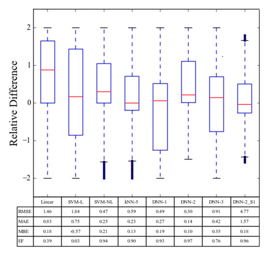 Statistical measures were used to quantify the ability of various ML models to predict an output from the PBMs. Calculated statistical parameters included the root mean square error (RMSE), the mean absolute error (MAE), the mean bias error (MBE), the model efficiency (EF), and the Relative Error . These statistical parameters were determined as: