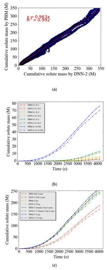 Figure 9a presents a scatter plot of the cumulative solute mass predicted by the DNN-2 model and observed by the PBM under near equilibrium conditions. The constructed DNN-2 relationship between input and output variables for near equilibrium conditions was very accurate. The goodness of the DNN-2 predictions for solute transport near equilibrium conditions is reflected by the statistical parameters (RMSE = 4.77 g, MAE =1.57 g, MBE = 0.18 g, and EF = 0.96 g) in Figure 8, the value R2 = 0.992 in Figure 9a, and the agreement between observed (PBM) and predicted results for the example simulations for various water contents (Figure 9b) and soil types (Figure 9c).