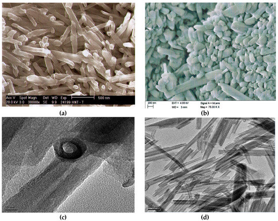 Scanning electron microscope images of halloysite nanotubes (a) HNT-MF4; (b) HNT-MF2; (c) and (d) HNT-MF7.
