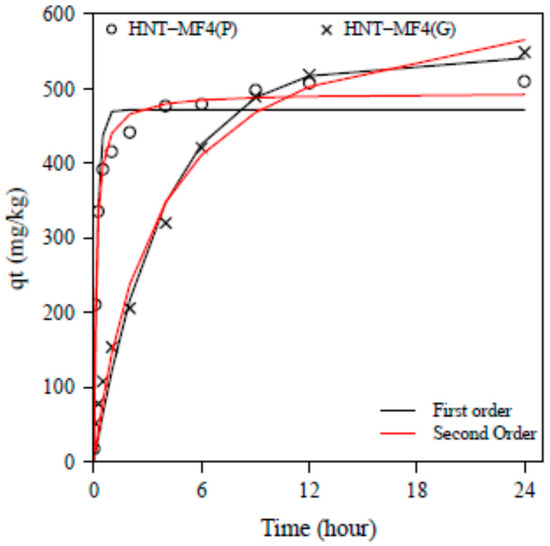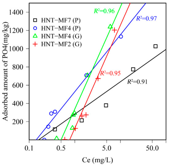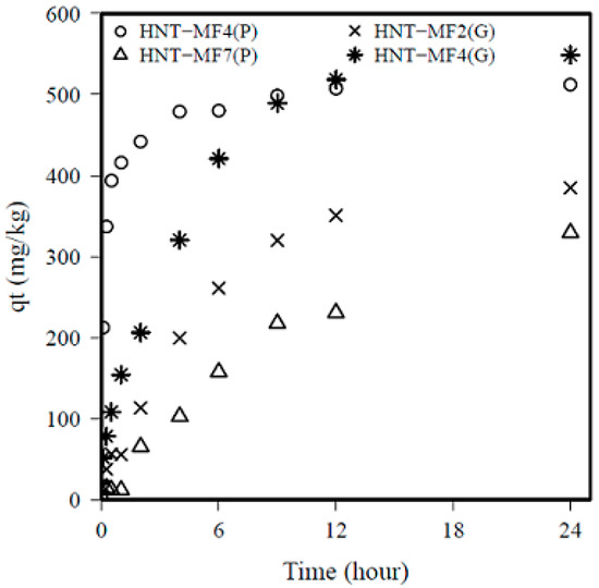 Principally, the kinetics of phosphate adsorption by HNTs illustrates two different steps of adsorption with different slopes. The adsorption dynamic is characterized by a fast first phase (first 4 h of the experiment) in which 50% of the final amount is adsorbed onto HNTs. The second step corresponds to slower kinetics reaching maximum adsorption at a constant rate beyond 18 h of the experiment (Figure 2). The data indicate that the equilibrium is attained at 24 h. The shaking time for the equilibrium tests was chosen accordingly. A 24 h kinetic experiment appears to be adequate to reach equilibrium, which is in agreement with prior studies [1]. Differences in the temporal dynamic can be attributed to less accessible adsorption site of phosphate and a limited diffusion process in case of granular HNTs. Among studied adsorbents, the amount of phosphate adsorbed on HNT-MF4 (G) (549 mg kg−1, 94.7%) was much higher than the values obtained for all other adsorbents at the same interaction time of 24 h.