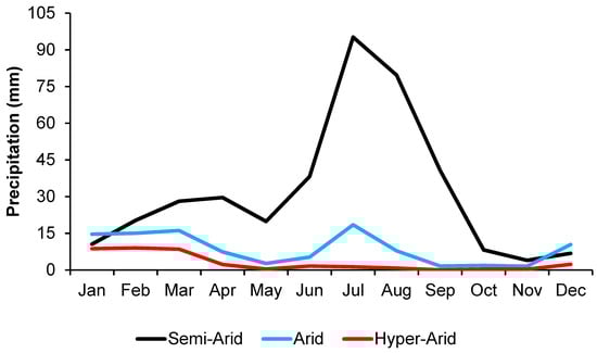 Monthly distribution of precipitation at semi-arid, arid, and hyper-arid regions.