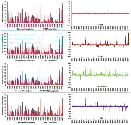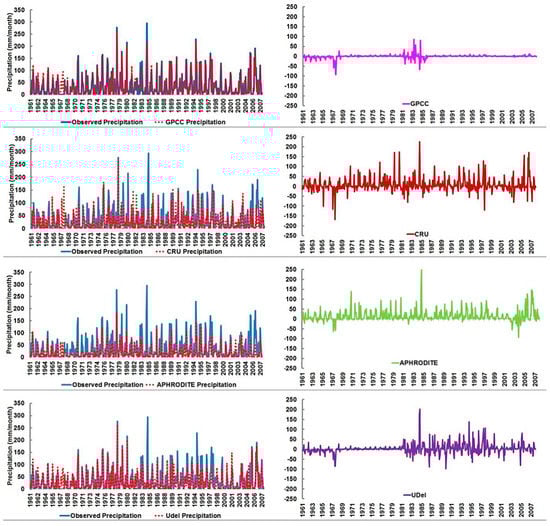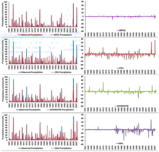 First, the monthly time series of observed and gauge-based gridded precipitation datasets were compared to show the ability of different precipitation datasets in representing the observed precipitation. The residuals or the differences between observed and precipitation datasets at different stations located in the hyper-arid, arid, and semi-arid region are shown in Figure 3, Figure 4 and Figure 5, respectively as examples.