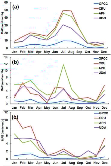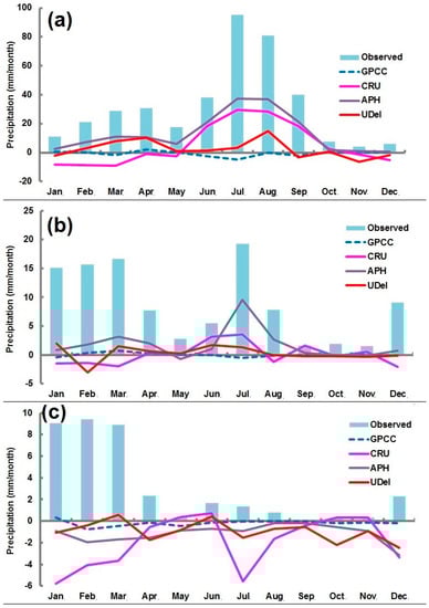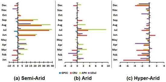 Mean absolute errors for semi-arid, arid, and hyper-arid are given in Figure 9. The figure showed that GPCC dataset is closer with zero in all stations, indicating that errors are less in GPCC. In semi-arid station (Figure 8a), CRU showed highest errors followed by APHRODITE and UDel. It is also observed that the errors are high in the months where precipitation is high and less where precipitation is less. The highest errors can be seen in the months of July and August while the lowest can be seen in the months of October, November, and December for all products.