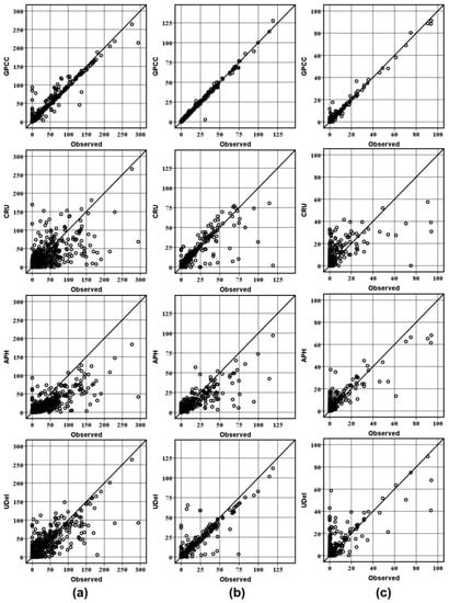 Scatter plot is also useful to reveal errors in different parts of the data. No matter how data is displayed, it is used to better understand how well the data products have estimated the observed data. Figure 7 shows the scatter plots of observed against gauge-based gridded precipitation for different climatic zones. The plots for each station are arranged in the vertical direction for comparison among different datasets. The plots for different data products at the semi-arid station are given in Figure 7a. GPCC plot shows a narrower scatter, which shows a large part of GPCC data is near to the observed value. It can be seen that most of the data of CRU and APHRODITE is dispersed and located away from the 45-degree line. The data above 100 mm is mostly under-predicted by these two products. Overall, the performance of GPCC was found better by predicting low as well as extreme values as compared to other data products at this station.