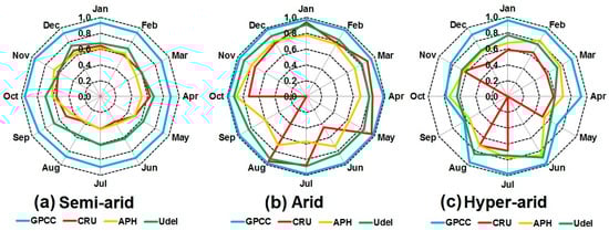 The results of the arid station are shown in Figure 10b. The higher index of GPCC can be visualized on the figure. It can be seen from the figure that GPCC have agreement above 0.90 in all the months. A better performance of other products can also be seen. CRU has the good agreement of above 0.70 with observed data in most of the months except June and September where the agreement of 0.45 and 0.0 is obtained. In the APHRODITE dataset, most of the months have the agreement of less than 0.70 that is quite low as compared to other datasets. It can also be noted that UDel has very close values with one in some of the months that indicate the superiority of UDel over APHRODITE and CRU.