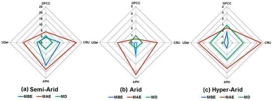 Mean bias error for different gauge-based gridded precipitation data products at (a) semi-arid, (b) arid, and (c) hyper-arid stations.