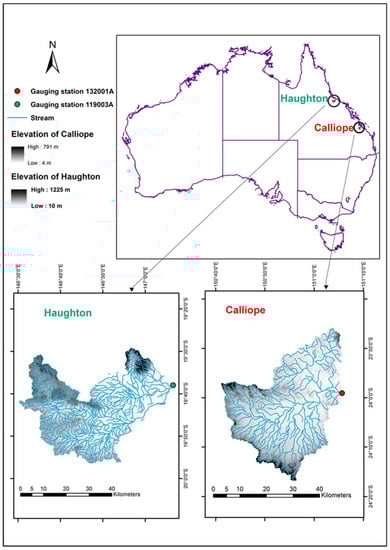Location of stations and drainage network maps of Haughton and Calliope Rivers.