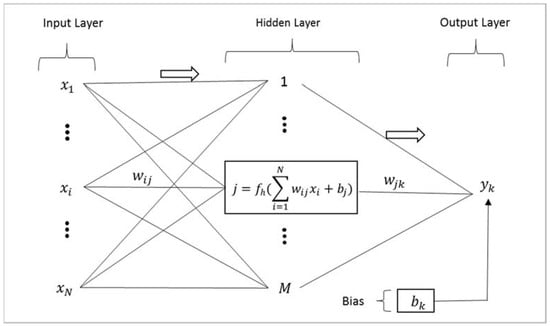 where, is the Jacobian matrix that contains the first derivatives of the network errors relating to the weights and biases, is a vector of network errors, is the identity matrix, and is learning rate with a positive scalar value adjusted at each iteration and governs the relative importance between the Gauss–Newton and gradient descent methods [58]. Details of ANNs and their theoretical foundation can be found in [48].
