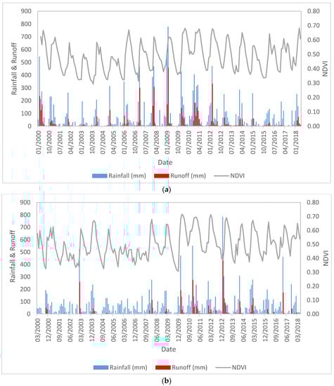 where, NIR and RED are the spectral reflectances measured in the near infrared and red wavebands, respectively. NDVI values range from −1 to 1, where −1 represents bare soil and 1 represents dense vegetation [67]. NDVI values in the two catchments during the period from 2000 to 2018 exhibited temporal variations. Given that the change in NDVI is very low during each month, the NDVI time series values in our study sites were obtained from images in the middle of each month without cloud cover. Investigation of NDVI values showed similar monthly patterns during study years. NDVI values decreased from June, reached a minimum in October or November, and then increased and reached a maximum in February or March in the both catchments (Figure 3a,b).