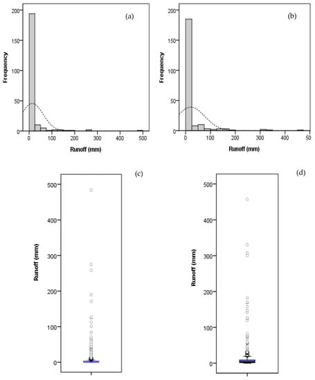 Initially, monthly runoff and rainfall data were surveyed to ensure there were no gaps in the time series, then 70% of the total data were selected for calibration and the remaining 30% were selected for validation for each catchment. The statistical parameters for calibration, validation, and total datasets of rainfall, runoff, NDVI and IC datasets were calculated and are shown in Table 2. For Calliope River (station 132001A), the mean ( and standard deviation values for the runoff validation datasets were higher than those for the calibration, but for Haughton River (station 119003A), the mean and standard deviation values for runoff validation datasets were less than those for the calibration (Table 2). Furthermore, the coefficient of variation of the runoff variable for Calliope River is greater than that of Haughton River. Both sites had relatively high values of skewness and kurtosis for both rainfall and runoff variables. Frequency distribution plots in these catchments exhibited non-normal distributions (Figure 4a,b). Based on the runoff box plots (Figure 4c,d), both stations contained several extreme runoff data that, together with the non-normal distribution of data, can affect ANN data-driven models and complicate runoff modelling.